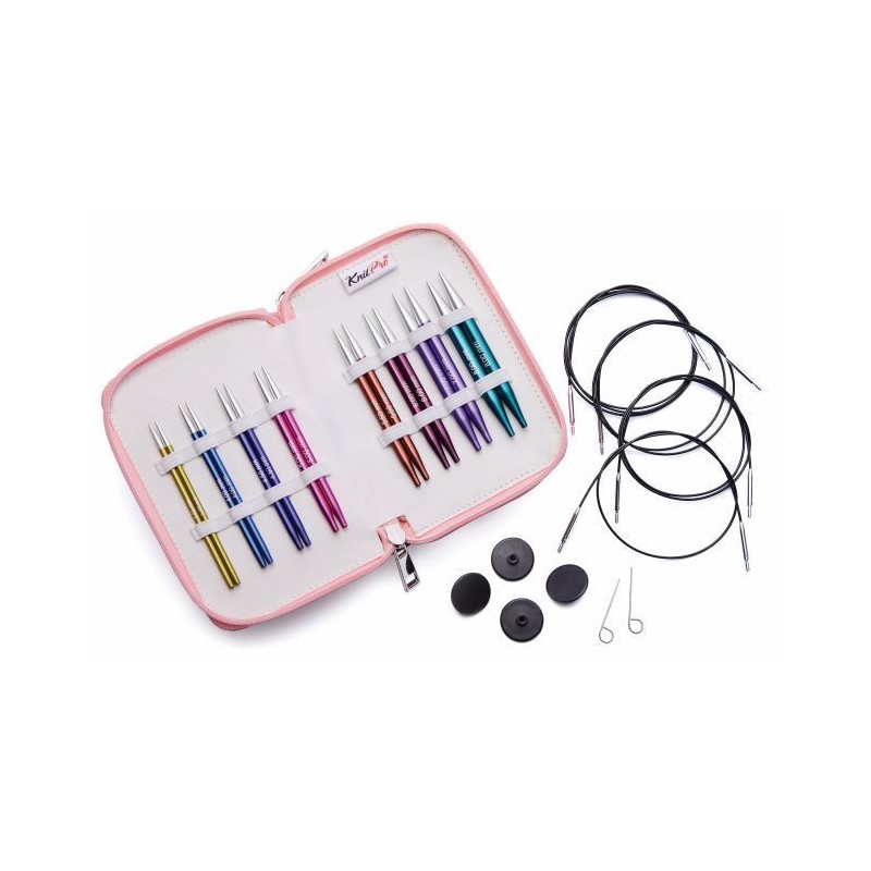 De set bestaat uit 8 paar korte naaldpunten in de maten 3.5mm, 4mm, 4.5mm, 5mm, 5.5mm, 6mm, 7mm en 8mm die gecombineerd kunnen worden met verschillende lengtes (2 x 40, en 2 x 50cm) swivel kabels met een stalen kern.