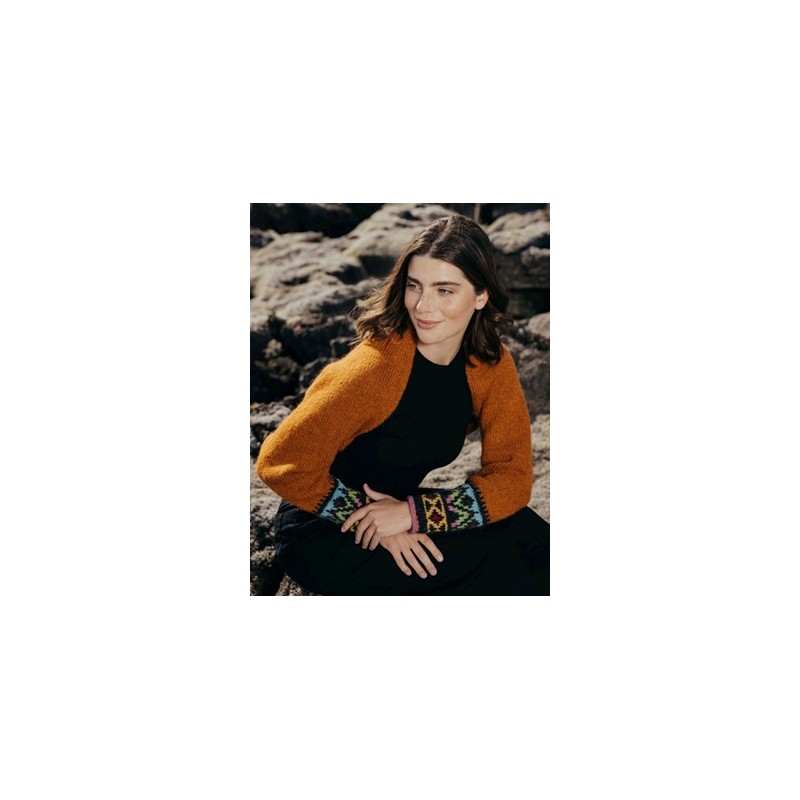 Deze bolero begint in het rond gebreid met 1 van de mouwen, daarna wordt de achterkant heen en weer gebreid en als laatste wordt de andere mouw in het rond gebreid. Deze bolero staat in het patroon omschreven in twee mogelijke kleurvarianten, een mos groene versie en een oranje versie. Deze bolero wordt gebreid van de Istex Lettlopi en is ontworpen door Védís Jónsdóttir voor lopidesign.is.