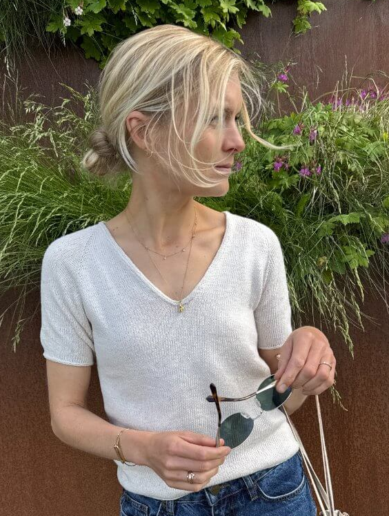 De Cumulus Tee wordt van boven naar beneden in het rond in tricotsteek gebreid van de Sandnes Tynn Line. Dit shirt heeft een V-hals afwerking. De mouwen komen tot de elleboog, en alle randen worden afgewerkt met een I-cord. Er is geen afwerking nodig op het einde.