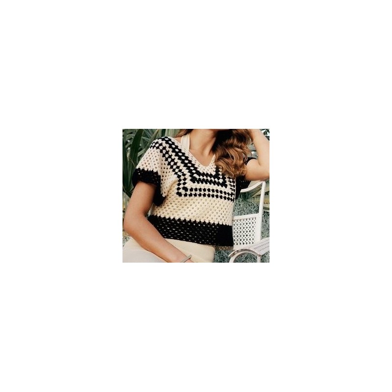 Dit leuke topje in stokjes-gaatjespatroon wordt gehaakt van de Ecopuno van Lana Grossa.