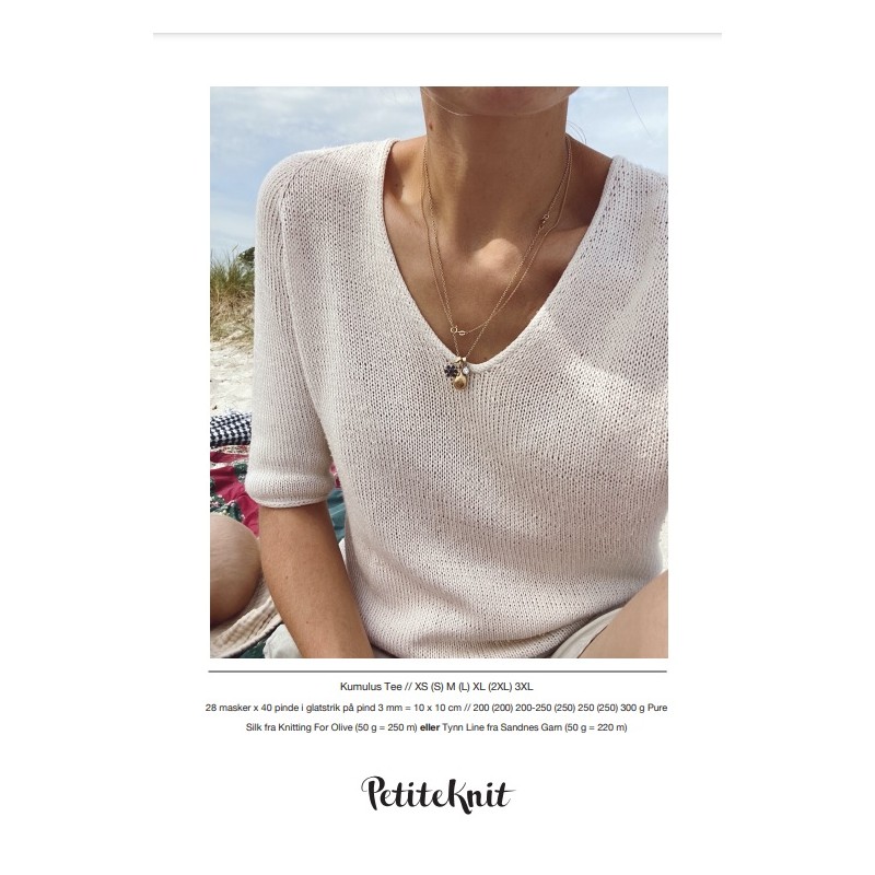 De Cumulus Tee wordt van boven naar beneden in het rond in tricotsteek gebreid met een ronde V-hals afwerking. De mouwen komen tot de elleboog, en alle randen worden afgewerkt met een I-cord. Er is geen afwerking nodig op het einde.