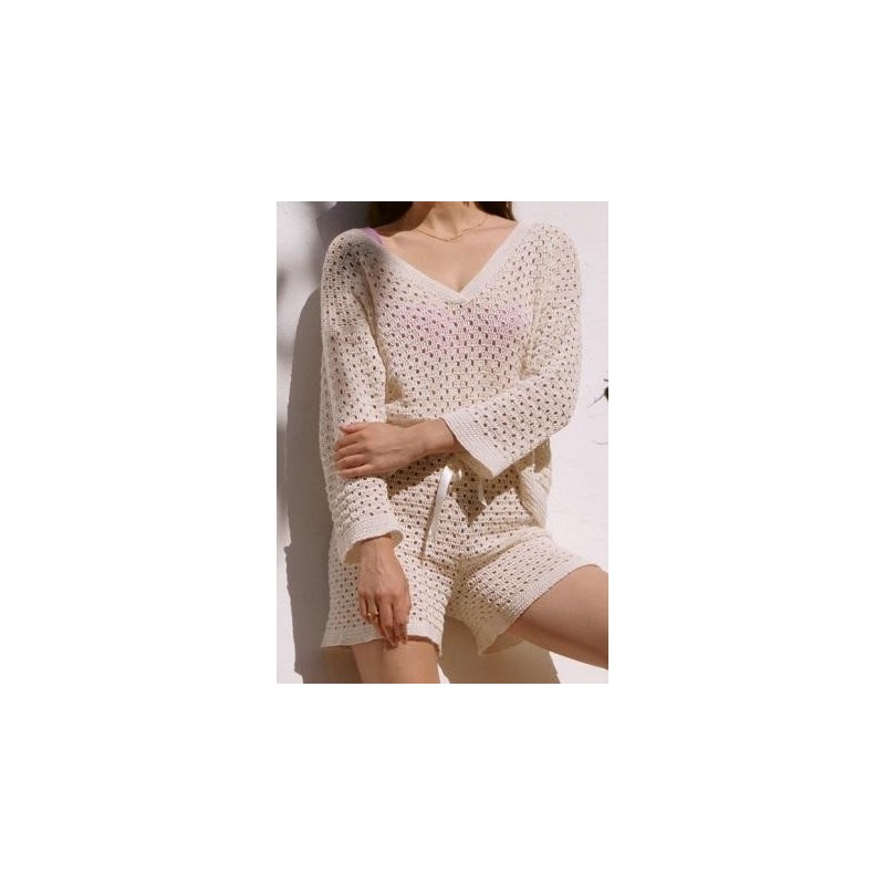 Deze leuke pullover met V-hals in een opengewerkt patroon wordt gehaakt van de Lana Grossa Nastrino. Hij is deel van een twinset, het broekje vindt u hier.