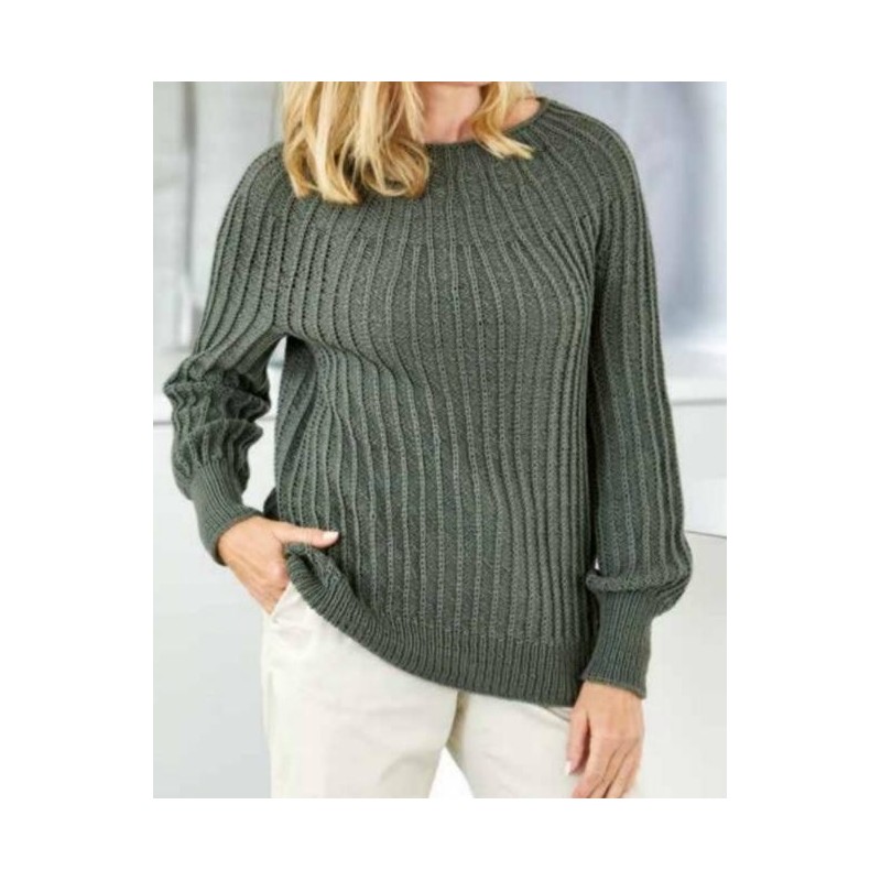 Deze mooie trui met ronde pas wordt topdown in patentsteek gebreid van de Cool Wool van Lana Grossa.