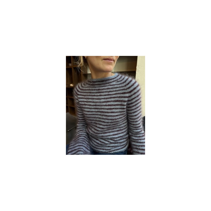 De Frankie Blouse van PetiteKnit met een dubbele draad gebreid. De trui wordt in een smal streeppatroon met raglan meerderingen aan één stuk van boven naar beneden gebreid. De hals wordt aan de achterkant gevormd met verkorte toeren. Voor de mouwen worden steken opgepakt die daarna in het rond naar beneden gebreid worden.