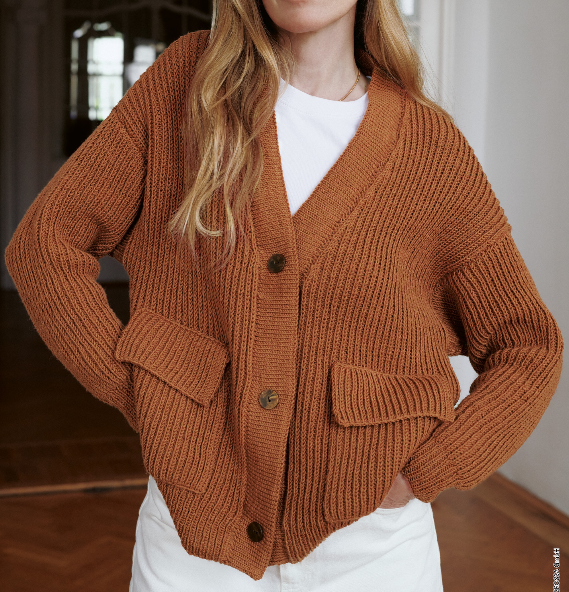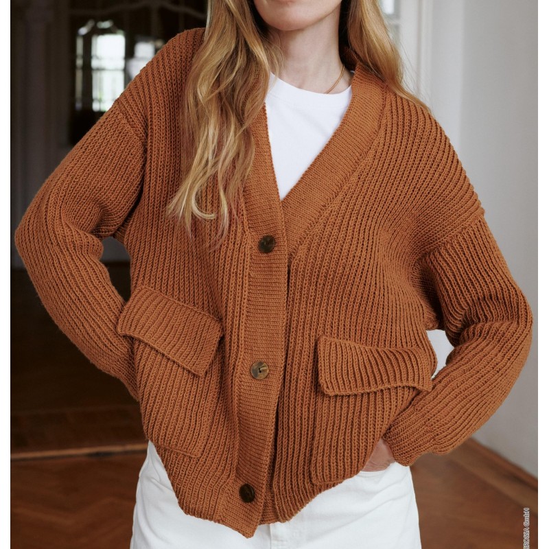 Dit mooie ruimvallende vest met zakjes wordt gebreid van de Cool Wool van Lana Grossa.