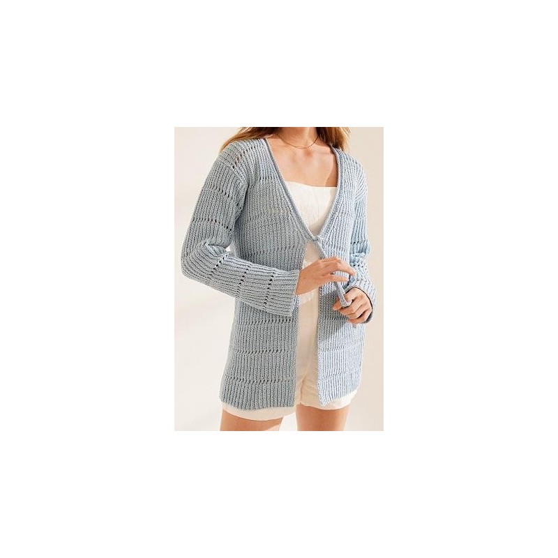 Dit halflange vest wordt gebreid in de halve patentsteek, met toevoeging van ajoursteek. De voorpanden worden aan elkaar vast geknoopt door een gebreid koord. Dit vest wordt gebreid van de Elastico van Lana Grossa.