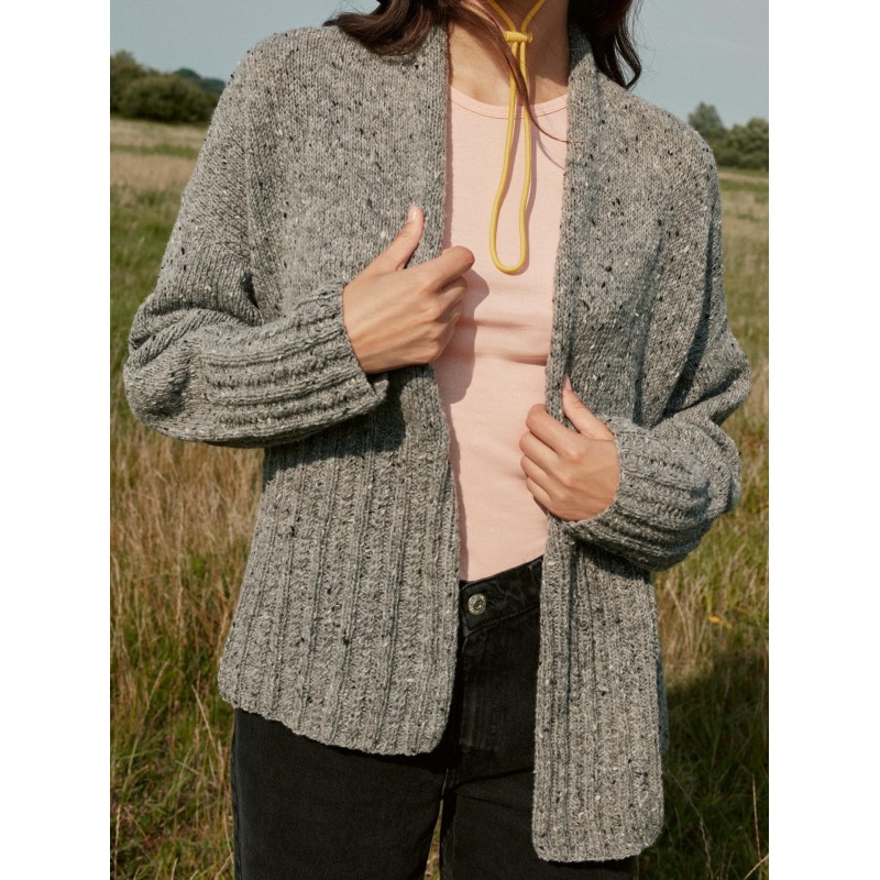 Dit mooie vest met brede boorden wordt gebreid van de Landlust Soft Tweed 180 van Lana Grossa.