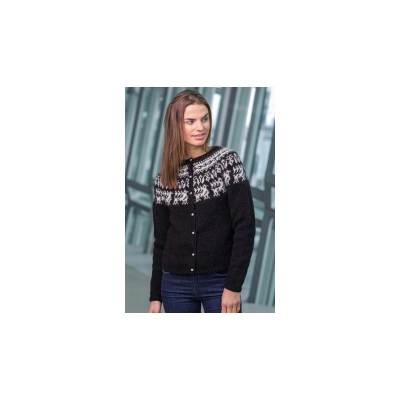 Dit vest met hertenmotief en knipbies wordt in het rond gebreid van Istex Lettlopi. Het patroon is ontworpen door Hulda Hákonardóttir, Elsa E. Guðjónsdóttir en Védís Jónsdóttir voor Lopidesign.is.