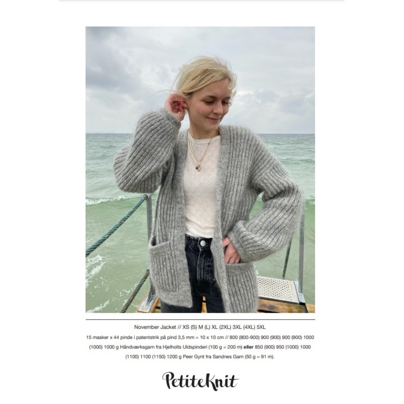 De November Jacket van PetiteKnit wordt van boven naar beneden gebreid in patentsteek van de Sandnes Peer Gynt. Je begint bovenaan met het breien van de achterkant, dan de schouders, de voorkanten, en dan samengevoegd tot 1 deel dat in heen en teruggaande toeren wordt gebreid. Vervolgens neem je de steken langs de armsgaten op voor het inzetten van de mouwen.