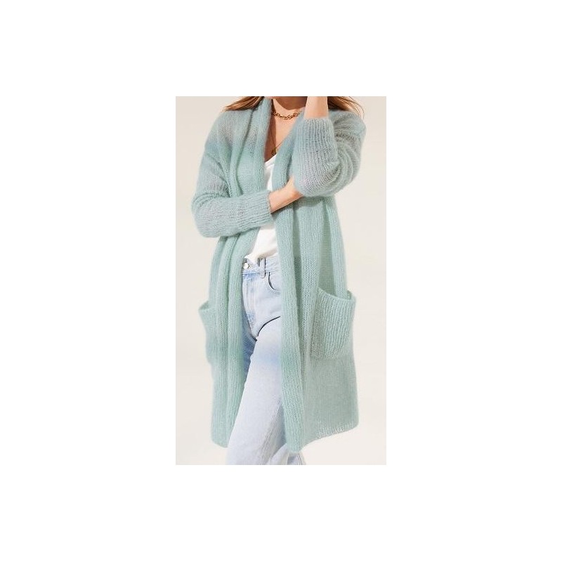 Dit lange vest met zakken heeft een klassiek openvallend model. Het vest wordt gebreid van de Silkhair van Lana Grossa, op iets dikkere pennen, waardoor het een luchtig vest blijft.