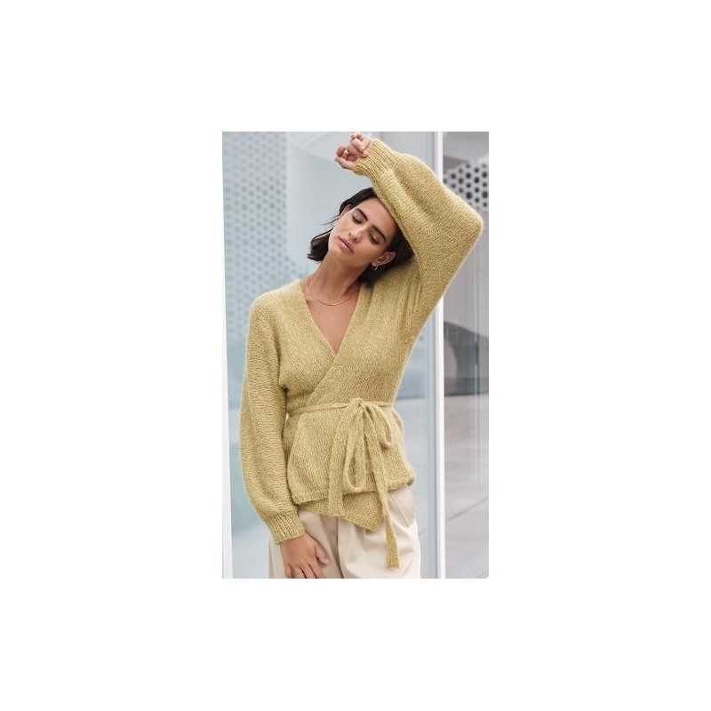 Dit mooie wikkelvest met ceintuur wordt met dubbele draad gebreid van de Setasuri van Lana Grossa.