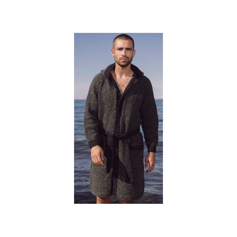 Deze stoere badjas wordt in het rondgebreid en heeft een knipbies. Deze badjas heeft een capuchon en wordt gebreid van de Istex Lettlopi. Het patroon is ontworpen door Védís Jónsdóttir voor Lopidesign.is.