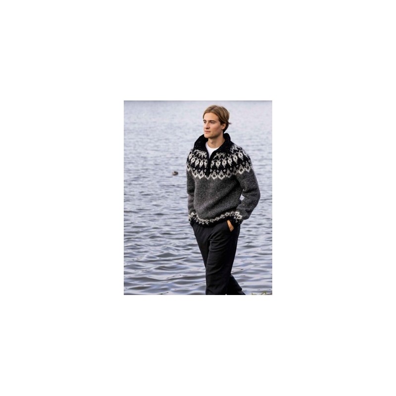 Deze IJslandse herentrui wordt in het rond gebreid, de halsband heeft een knipbies. Deze trui wordt gebreid van de Istex Alafosslopi en is ontworpen door Védís Jónsdóttir voor lopidesign.is.