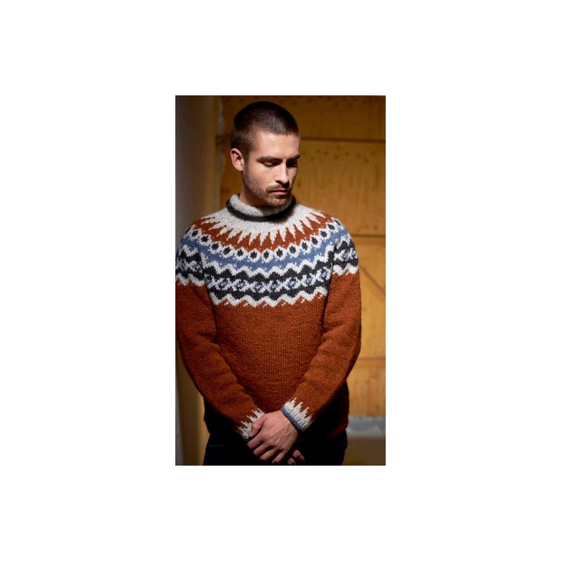 Deze IJslandse trui staat beschreven voor 2 kleurencombinaties, een grijze versie en een roestkleurige versie. Deze trui wordt van de Istex Lettlopi in het rond gebreid en is ontworpen door Védís Jónsdóttir voor Lopidesign.is.