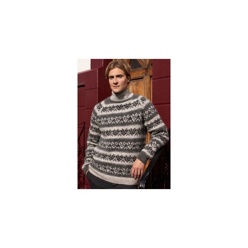 Deze IJslandse herentrui is beschreven in twee verschillende kleurencombinaties, een groene en een grijze versie. De trui wordt in het rond gebreid van Istex Lettlopi en is ontworpen door Védís Jónsdóttir voor Lopidesign.is.