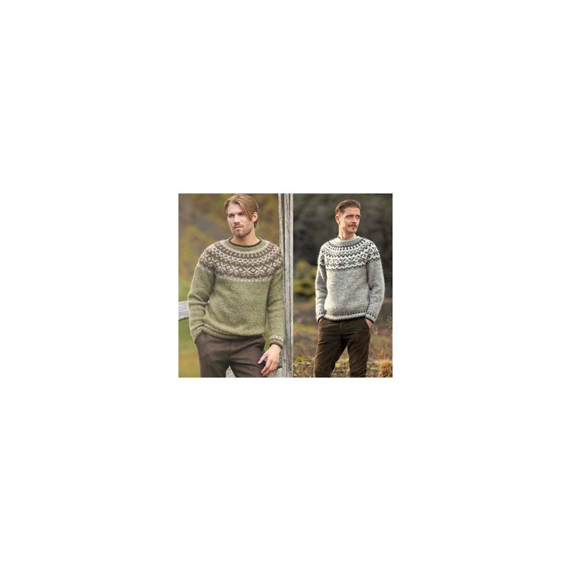 Deze trui staat in het patroon omschreven in twee mogelijke kleurencombinaties, een grijze versie en een groene versie. Deze trui wordt in het rond gebreid van de Istex Lettlopi en is ontworpen door Védís Jónsdóttir voor Lopidesign.is.