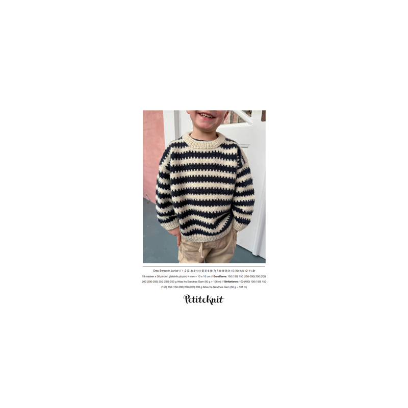 De Otto Sweater Junior van PetiteKnit wordt van boven naar beneden gebreid in een gestreept patroon. Eerst wordt de achterkant van het schoudergedeelte gebreid. Daarna worden de schouders apart heen en weer gebreid. Deze worden in het rond gesloten om de voorkant van het schoudergedeelte te vormen. Vervolgens wordt het lijf in het rond gebreid.