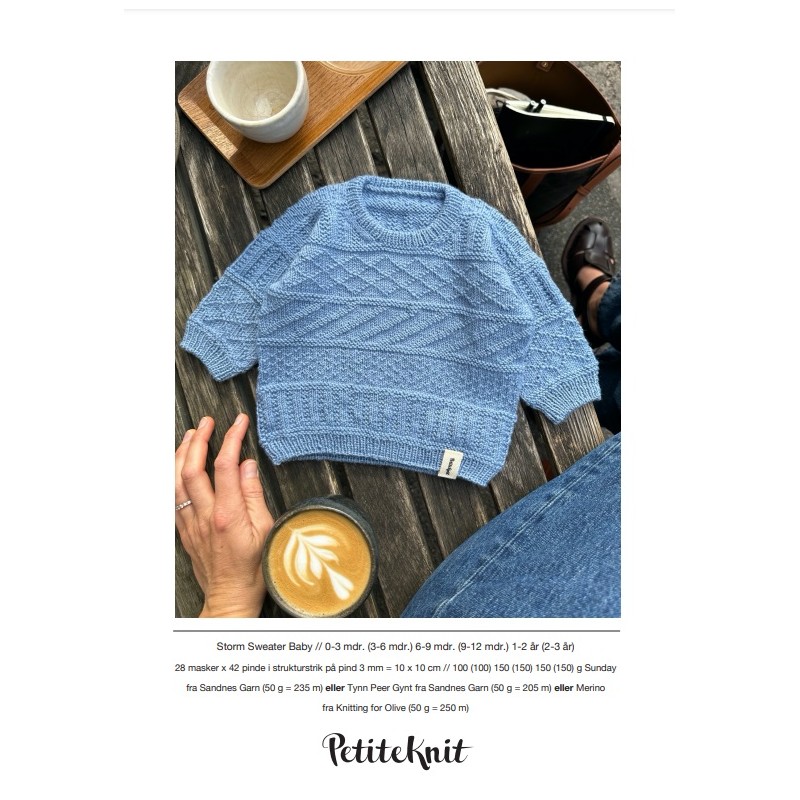 De Storm Sweater Baby van PetiteKnit wordt van boven naar beneden gebreid in een afwisselend textuur patroon. Eerst wordt het schouderdeel in heen en teruggaande toeren gebreid. Daarna wordt het voorpand vanaf de schouderopzet gebreid en vanaf de oksels samengevoegd met het rugpand om het lijf te vormen, dat vervolgens in het rond wordt gebreid. De mouwen worden in het rond op naalden zonder knop gebreid.