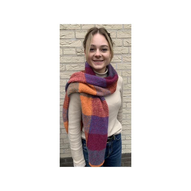 De Soft Blocks Sjaal van Poefs en Toffels wordt gebreid van de Ecopuno en Setasuri van Lana Grossa.