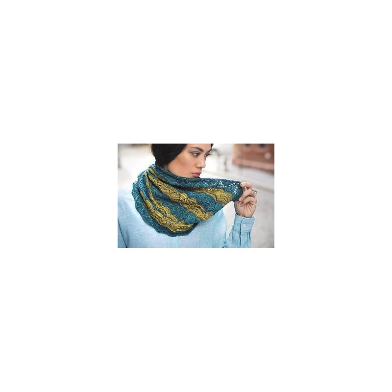 Deze colsjaal met geschulpt strepenpatroon wordt in het rond gebreid van twee contrasterende kleuren Malabrigo Sock.