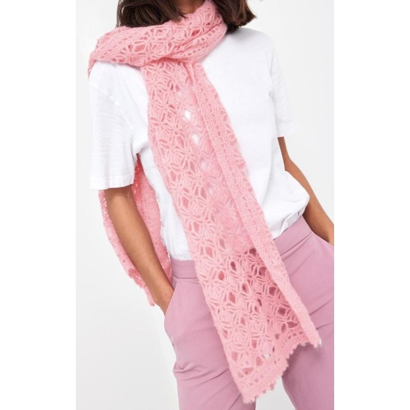 Deze mooie sjaal met een leuk patroontje wordt gehaakt van de Lana Grossa Setasuri. De complete sjaal heeft een afmeting van ca. 46 x 184 cm