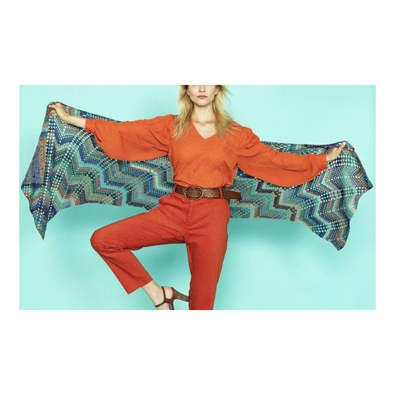 Deze sjaal met chevron patroon wordt gehaakt van Schoppel Zauberball Crazy. Het patroon is Duitstalig.