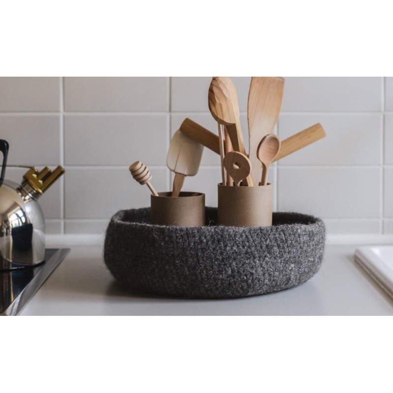 Deze grote vilten schaal wordt gehaakt van Lana Grossa Feltro, de maat is ca. 10 cm hoogte x 29 cm doorsnee.