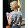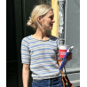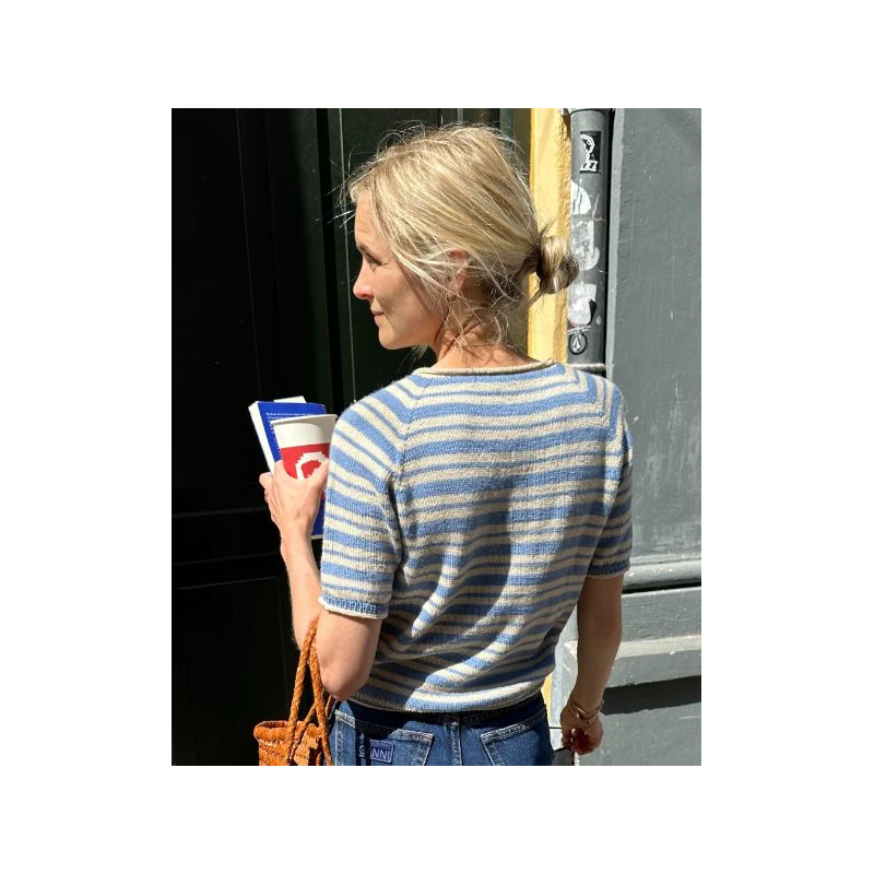 De Amélie Tee van PetiteKnit wordt van boven naar beneden gebreid in tricotsteek met strepen. Je begint bovenaan in heen, en teruggaande naalden om de vorm van de hals te krijgen. Vervolgens wordt in het rond verder gebreid met raglanmeerderingen.
