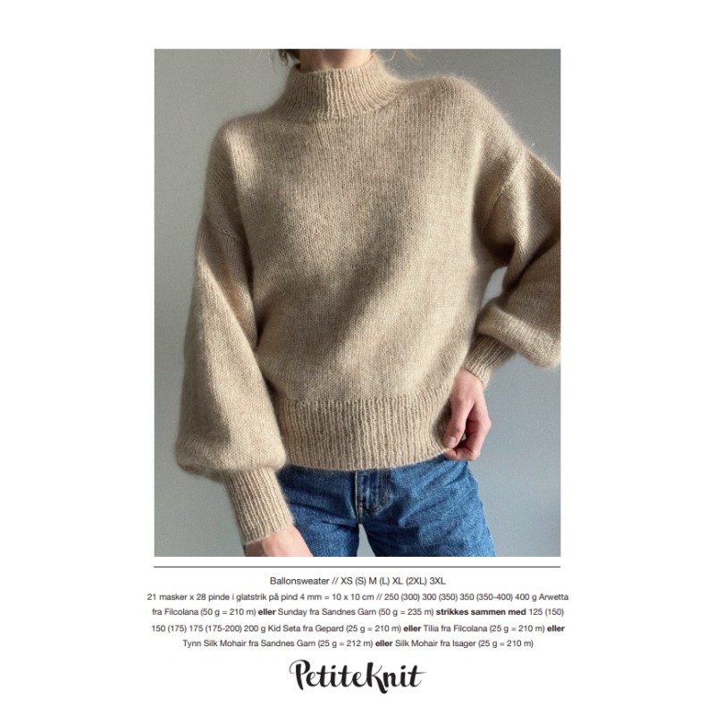 De Balloon sweater van PetiteKnit heeft ballonmouwen geaccentueerd door een strakke boord bij de pols. De trui wordt van boven naar beneden gebreid. Eerst worden schoudermeerderingen en verkorte toeren gebruikt om de halsrand te vormen. Hierna worden voor- en achterpand gescheiden en apart in tricotsteek verder gebreid tot aan de armsgaten. Hierna worden de steken weer samengevoegd en wordt het werk verder in het rond naar beneden gebreid. Als laatste worden steken opgepakt voor de mouwen en worden deze in het rond naar beneden gebreid.