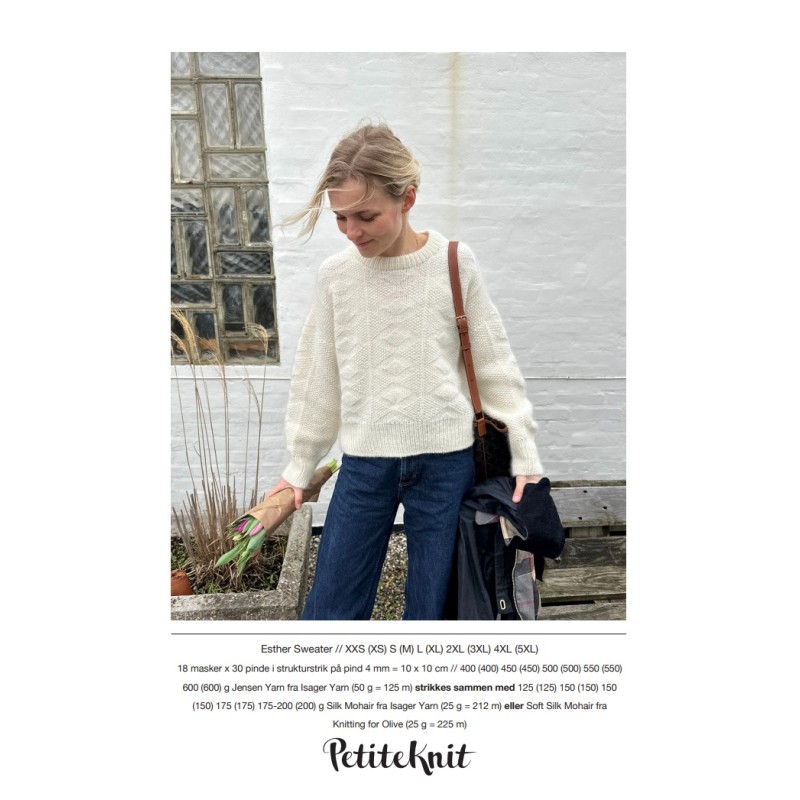 De Esther Sweater van PetiteKnit wordt van boven naar beneden gebreid in een textuurpatroon. Eerst wordt het rugpand gebreid en gevormd met meerderingen om de schouderafschuining te vormen. Daarna worden steken opgenomen bij de schouders die vervolgens worden samengevoegd om het voorpand te vormen. Het voor- en achterpand worden samengevoegd om het lijfdeel verder in het rond te breien.