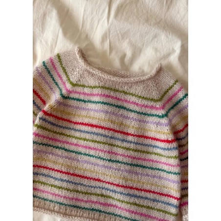De Frankie Sweater Baby van PetiteKnit wordt van boven naar beneden gebreid, met raglanmeerderingen op het schouderstuk. Om de hals mooi te vormen, brei je verkorte toeren aan de achterkant van de hals. De mouwen worden in het rond gebreid, met een setje sokkennaalden of met een rondbreinaald en de Magic Loop-techniek.