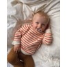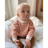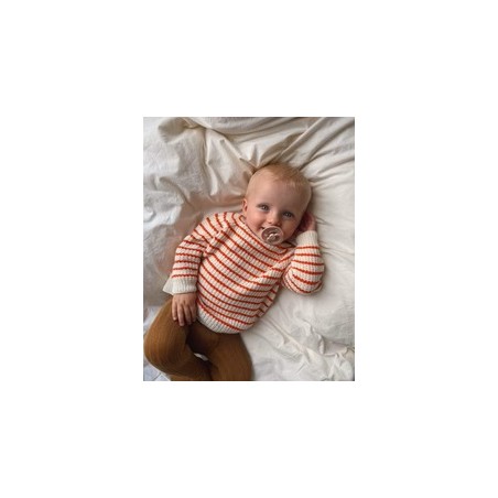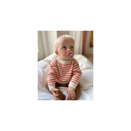 De Friday Sweater baby word van boven naar beneden gebreid in een gebroken boordsteek met raglanmeerderingen. De halsrand word in boordsteek gebreid en omgevouwen net zoals de zoom en de boordjes.