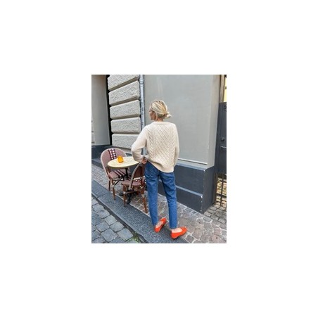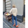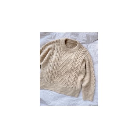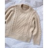 De Moby Sweater van PetiteKnit wordt van boven naar beneden gebreid in een structuur- en kabelpatroon. Eerst wordt het achterpand gebreid en gevormd met behulp van verkorte toeren om de afschuining van de schouders te vormen. Hierna worden voor elke schouder steken opgenomen, die vervolgens worden samengevoegd om verder in het rond te breien.
