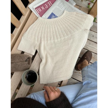 De Sunday Tee van PetiteKnit wordt van boven naar beneden gebreid. De ronde pas wordt met meerderingen in een rond boordsteekpatroon gevormd. Hierna wordt de rest van het shirt in tricotsteek gebreid.