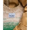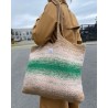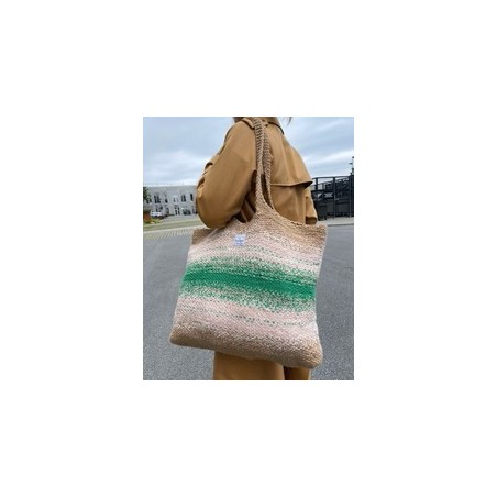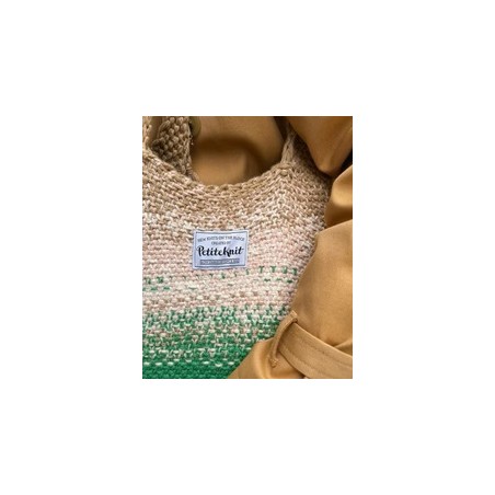 De Technicolor Shopper van PetiteKnit wordt van onder naar boven gebreid in een linnensteek. De tas is gemaakt van drie strengen garen die bij elkaar worden gehouden, en de geleidelijke overgangen tussen de kleuren worden bereikt door voortdurend te wisselen tussen de verschillende kleuren garen.