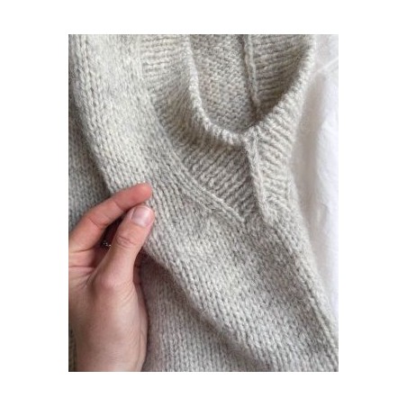 De Weekend Slipover van PetiteKnit wordt van boven naar beneden gebreid. Je begint met het rugpand, waarbij je met verkorte toeren de schouderafschuining vormt. Daarna brei je de schouders apart en voeg je die samen tot het voorpand. Voor- en achterpand worden vervolgens aan elkaar gebreid en in het rond verder gebreid tot aan de onderkant. Tot slot brei je de geribbelde hals en armsgaten, waarbij je bij de armsgaten mindert voor een mooie pasvorm